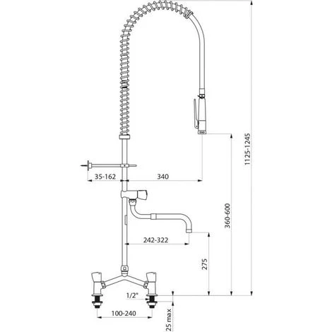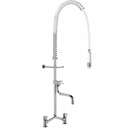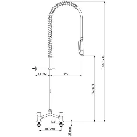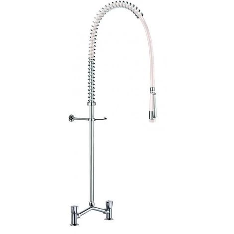 Robinets « Grande cuisine »Mélangeur de prélavage 2 trous à douchette Mélangeur 2 trous sur table avec têtes à clapet et croisillons.Entraxe réglable de 100 à 240 mm.Combiné de prélavage complet avec colonne 20×27 en laiton.Collier mural réglable.Fle Fabrication Française 10 Ans Garantie