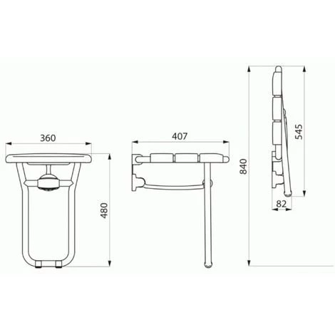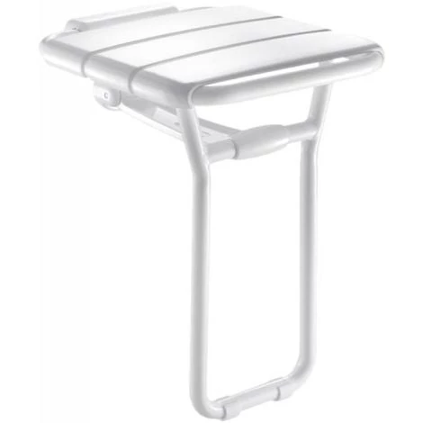 Produit handicapSièges de doucheSiège de douche relevable alu Siège avec pied à fixer au mur 407 x 360 x 480 mm. Structure en tube aluminium époxy blanc Ø 25 mm, épaisseur de 2 mm. Assise avec 3 lattes larges en plastique blanc. Renfort par un pie Fabrication Française 10 Ans Garantie